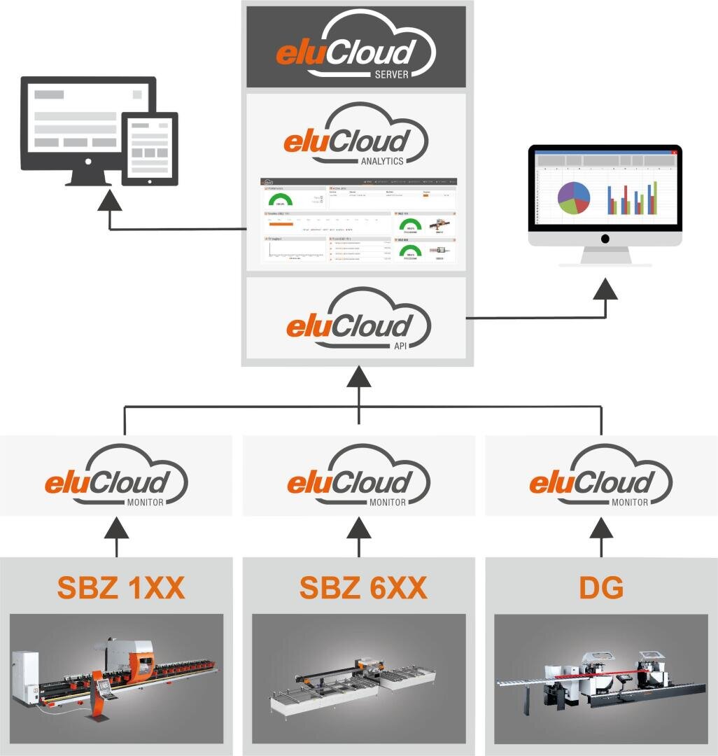 Die Produktgruppe eluCloud umfasst vier verschiedene Module und eine App, die eluCloud-Funktionen auf dem Smartphone, Tablet, Laptop oder PC weltweit abrufbar macht. Mit dieser App kann der Anwender von unterwegs auf dem Smartphone sehen, wie die Maschinen zuhause im Betrieb laufen. Für Geschäftsreisende ist die App wie ein Fernglas, mit dem sich Entwicklungen zuhause voraussehen lassen. Gut informiert, kann so schnell reagiert werden, wenn es Abweichungen von geplanten Abläufen gibt. Die vier eluCloud-Module heißen eluCloud-Monitor, eluCloud-Server, eluCloud-Analytics und eluCloud-API.